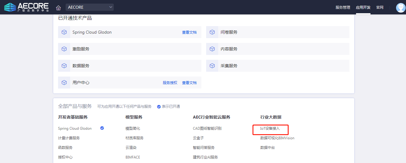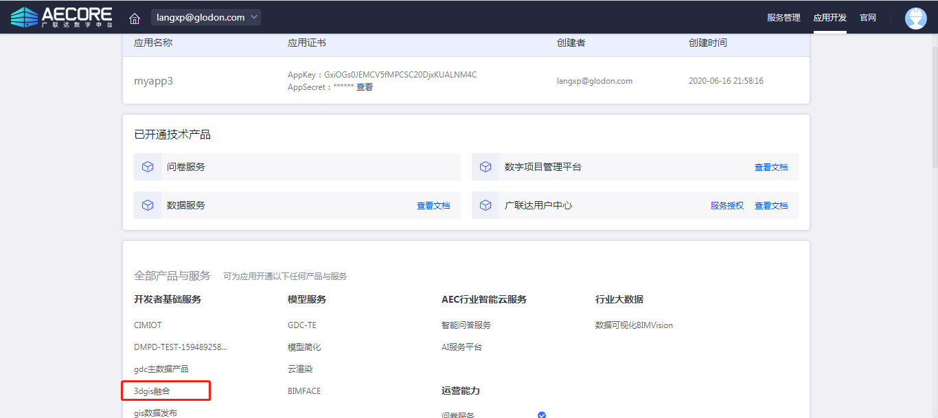 step1:登录AECORE,创建应用,开通3DGIS服务,点击查看3DGIS服务详细操作手册