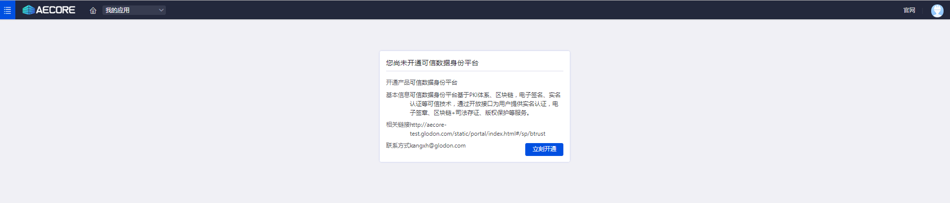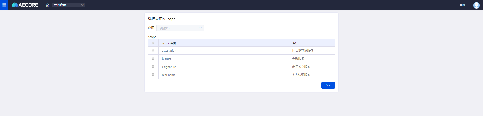 登录AECORE,并创建应用,创建应用后即可获取appkey、appsecret,这是调用服务的秘钥请妥善管理。