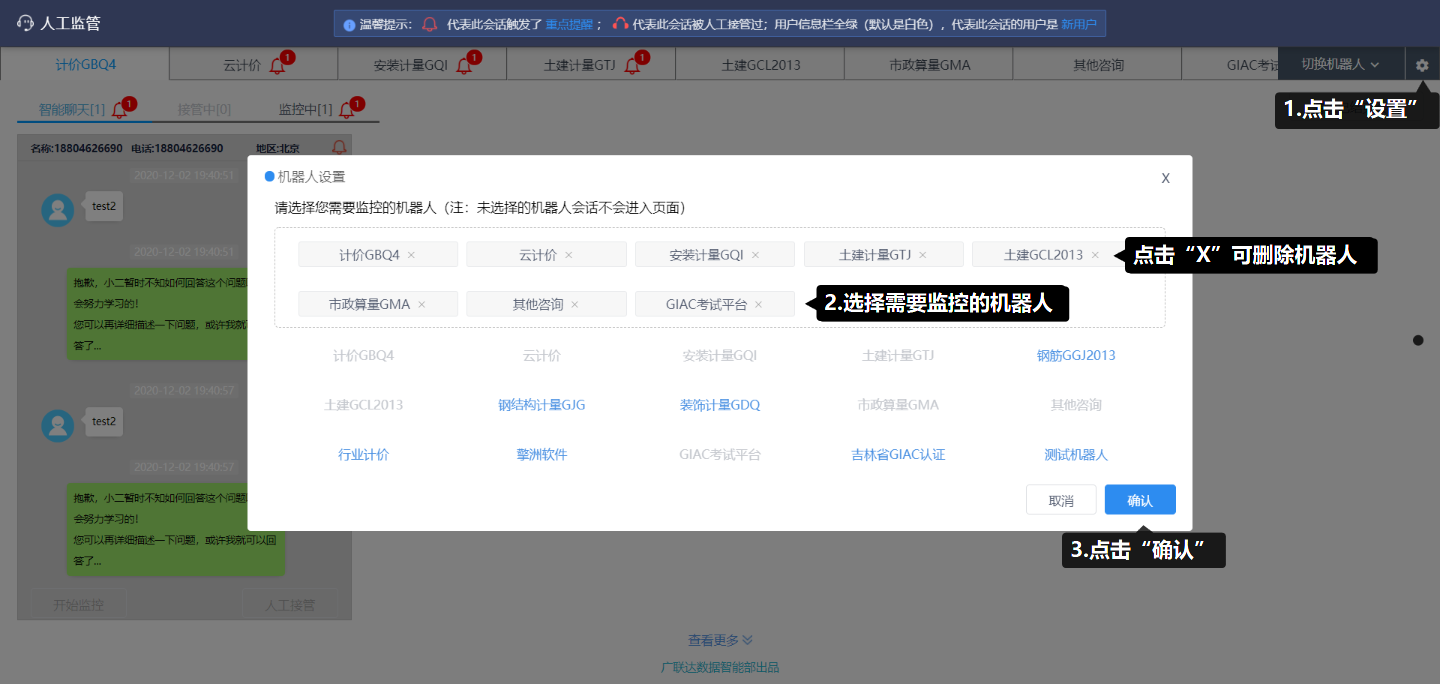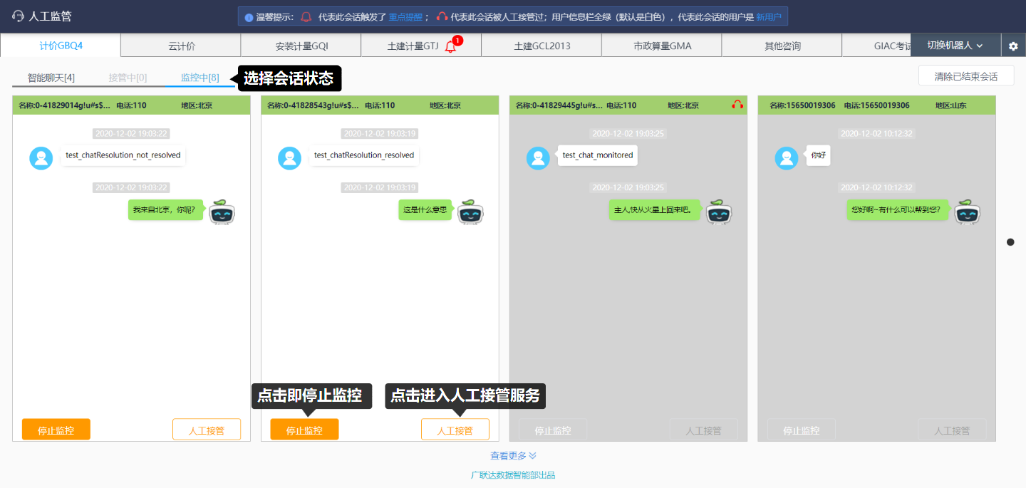 (1)亮起的聊天界面表示正在进行咨询的会话,可以选择开始监控或者人工接管;
