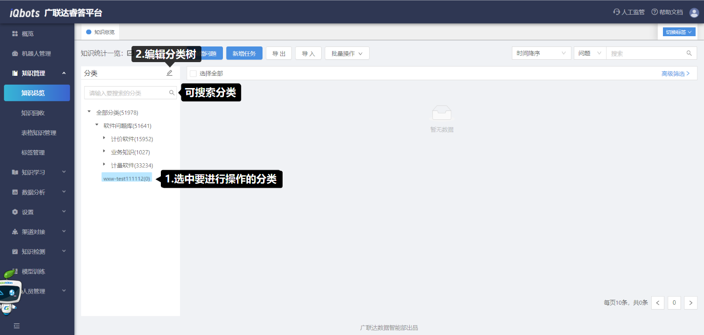 在知识总览页面,可以完成知识分类管理、问题的增删改查、问题的相似问法管理等。