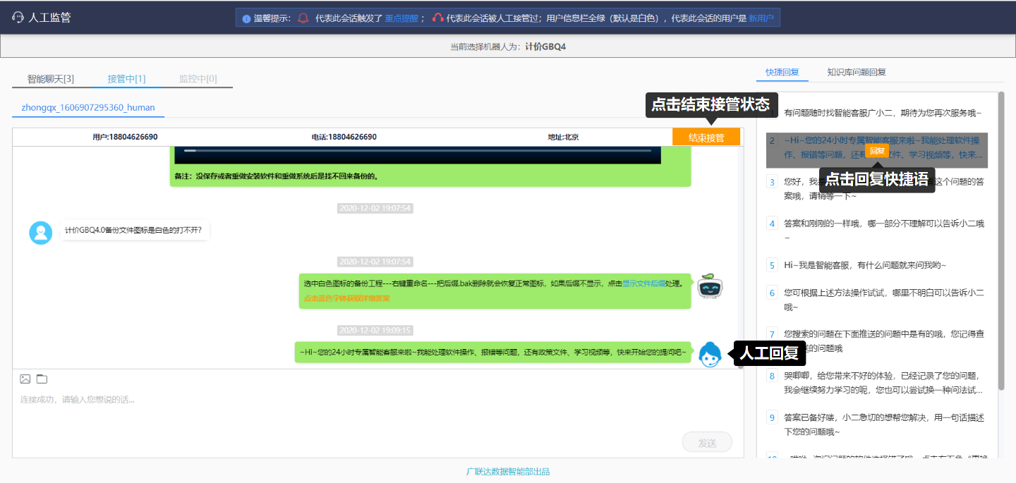 点击首页中右上角的“人工监管”图标,可以进入相应的人工监管服务页面。在人工监管页面中,可以选择需监控的机器人,并看到智能聊天的会话。在机器人回答效果不好时,主动接管会话进入人工服务后,可有效及时地解决用户问题,提升用户体验。