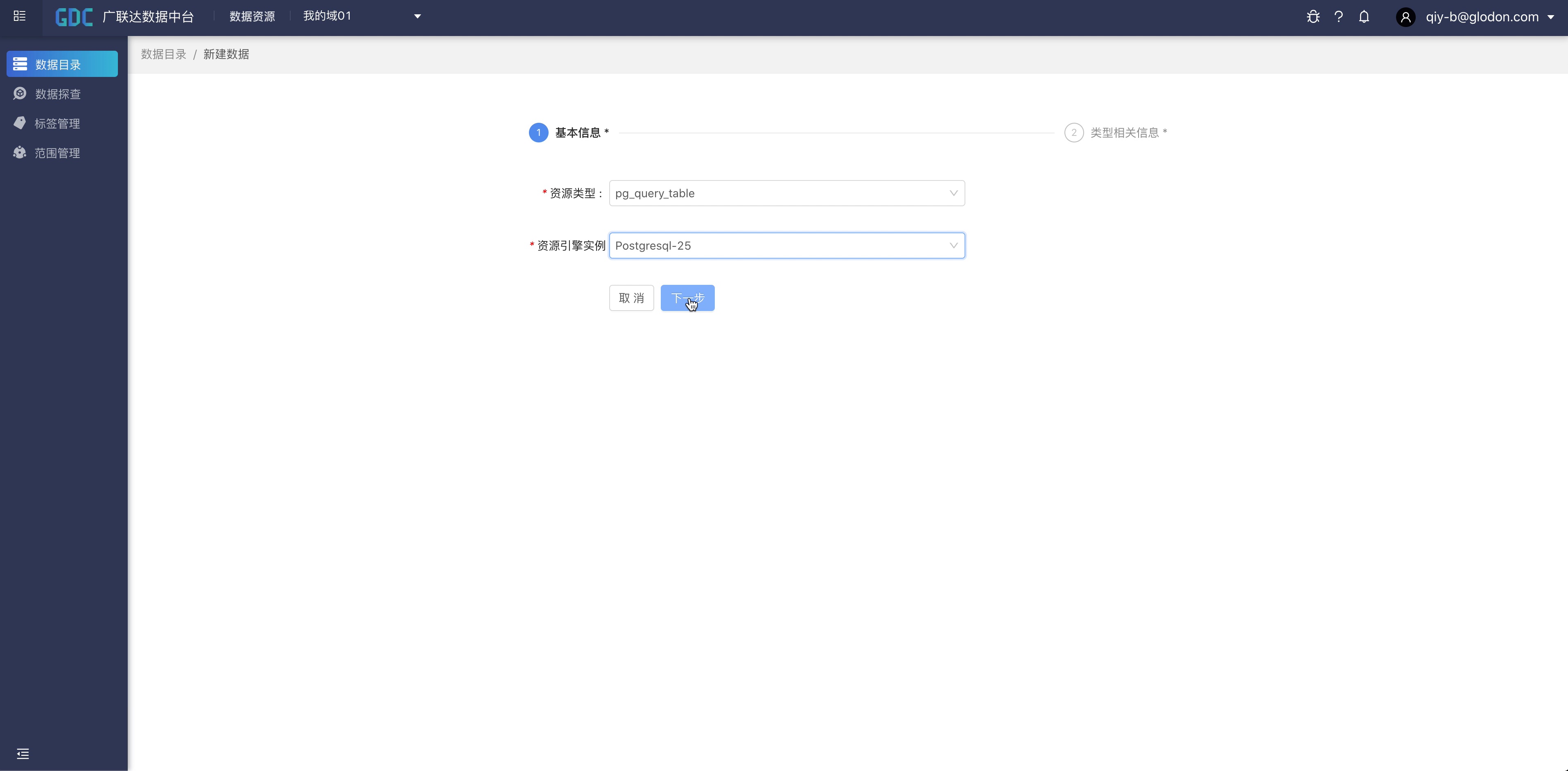 在已创建的域的卡片上点击“数据资源”,进入数据资源模块后,点击上面的“新建数据表”。首先选择要创建的资源的类型,以及存储的引擎实例。