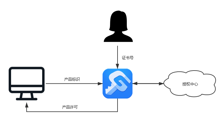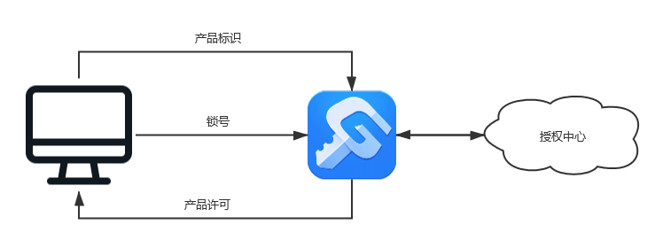 接入授权中心的产品提供方,在销售员售卖其产品给用户的时候,会将用户对应的客户信息,购买的产品信息,分配的许可载体信息和使用权限信息等同步到授权中心,待用户打开产品时,通过某种机制将产品标识和许可载体标识传递给授权中心进行验证,由授权中心下发产品许可告知产品是否允许继续执行。