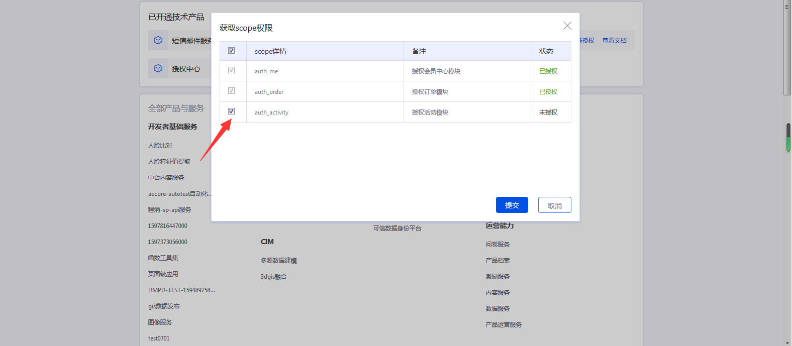 1、集成授权活动中心提供的接口之前,请完成前置准备操作并申请开通授权活动模块的应用scope。