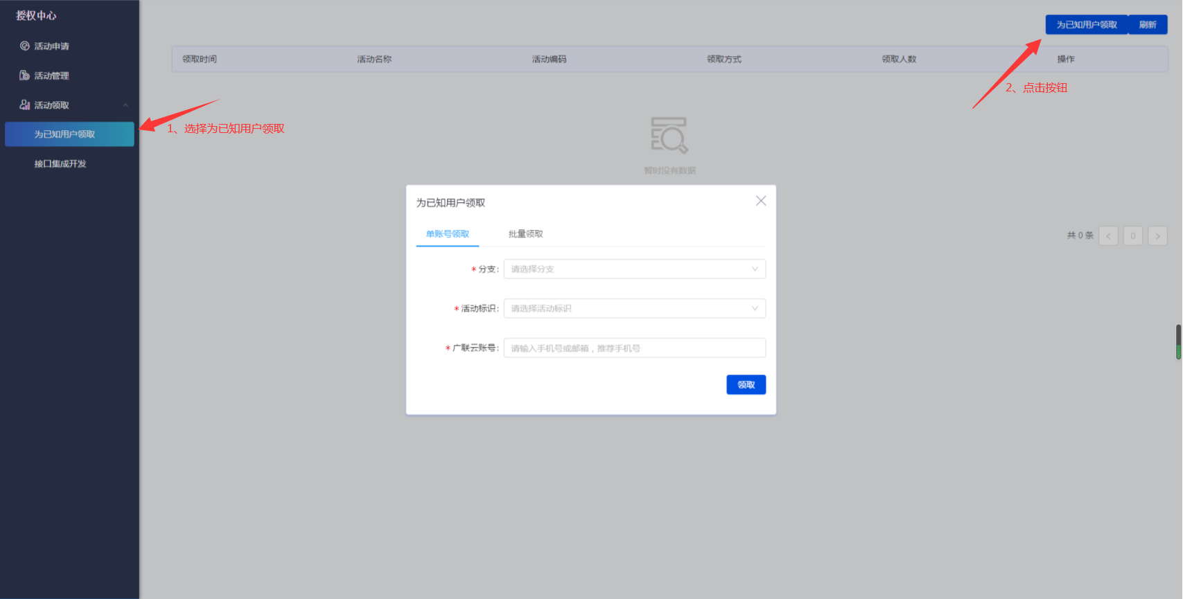 单账号领取:用于为单个用户在后台参与活动,领取产品权限。