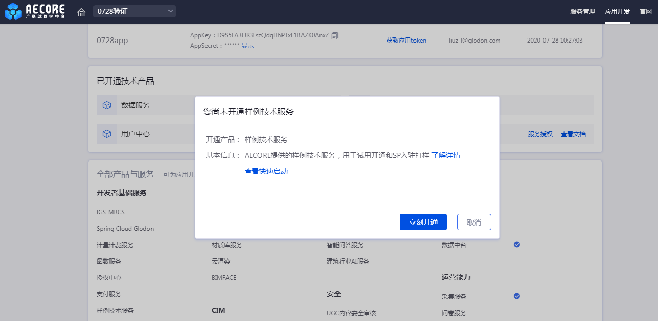 服务注册步骤完成后,等待AECORE管理员在后台审核并发布服务。服务发布后即会出现在ISV控制台,所有的开发者可以通过AECORE调用该服务。
