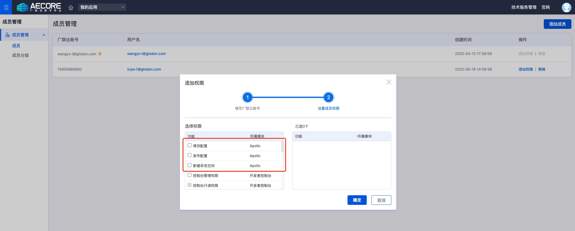 为了提高安全性防止误操作,可以对参与应用的成员进行apollo权限管理,通过点击AECORE应用的成员管理按钮进入工作空间添加相应的成员并分配相应的权限