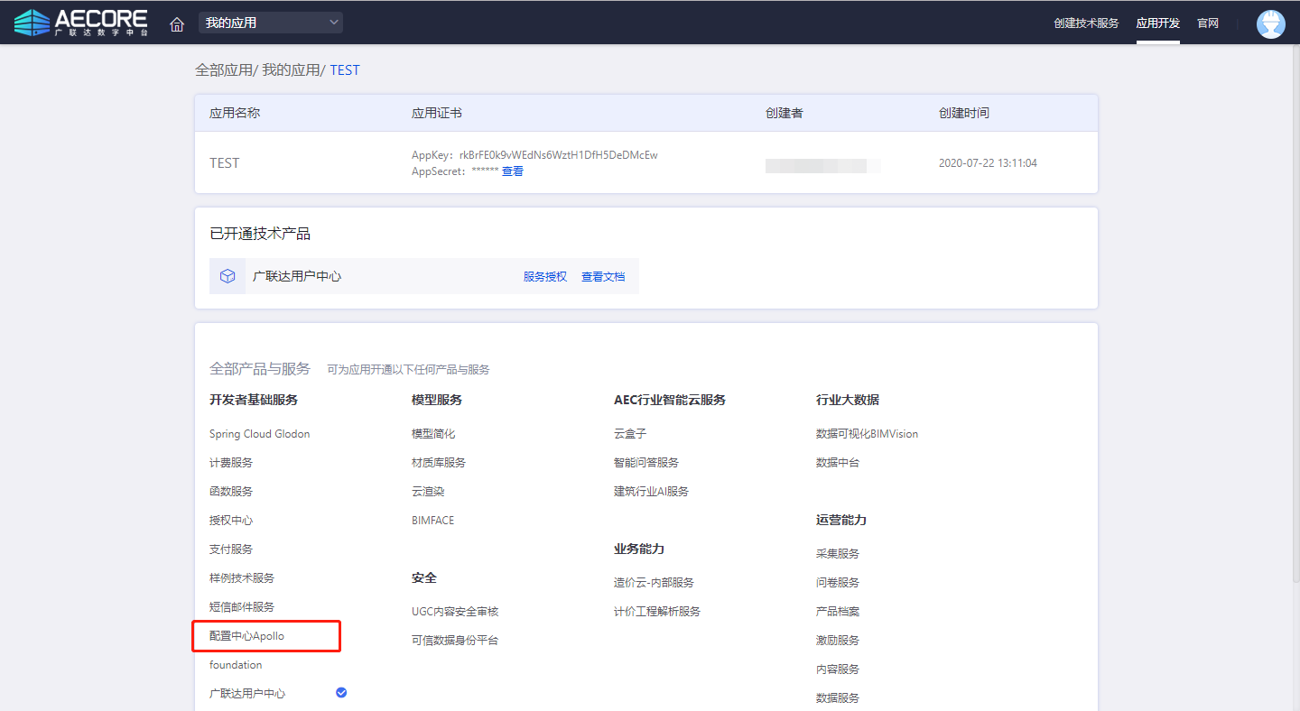 登录AECORE,并创建应用,创建应用后即可获取appkey、appsecret,这是调用服务的秘钥请妥善管理。