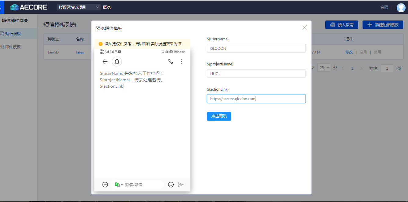 获取邮件、短信模板操作:1、登录AECORE;2、开通邮件短信服务;3、创建邮件、短信模板