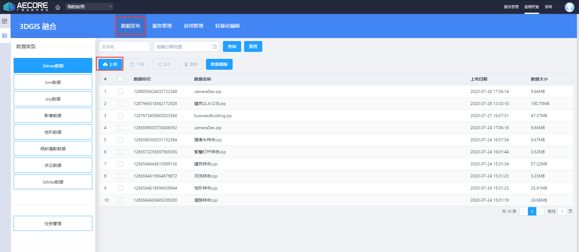 在数据列表中选择要进行发布的3dmax数据,此时,列表上方的操作【上传】、【下载】、【发布】、【删除】均可以进行操作,如下图: