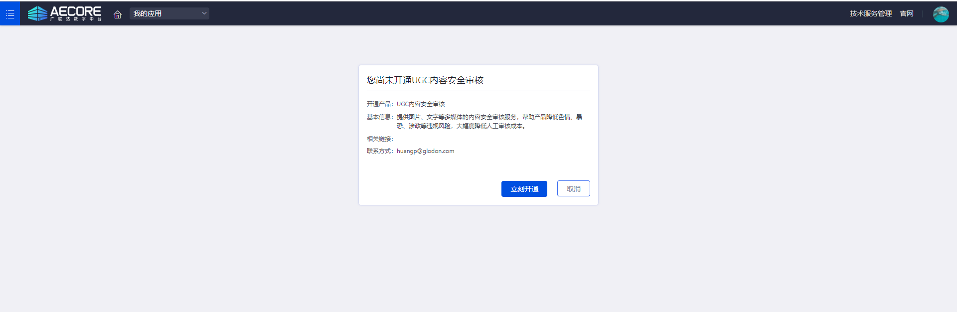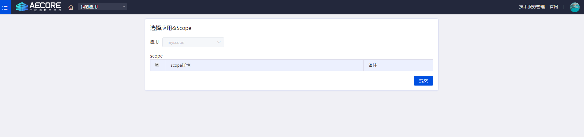 登录AECORE,并创建应用,创建应用后即可获取appkey、appsecert,这是调用服务的秘钥请妥善管理。